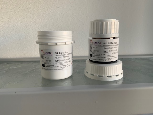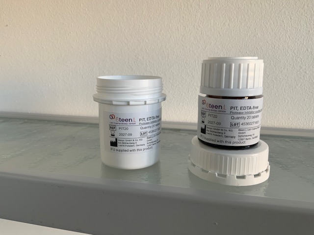 Seit über 30 Jahren entwickeln und fertigen wir Protease Inhibitor Tabs (PIT) für den zuverlässigen Einsatz in Forschung und Laborroutine. Für eine einfache Planung bieten wir klare Bestellgrößen: PIT5 (5 Tabs), PIT10 (10 Tabs) und PIT20 (20 Tabs).